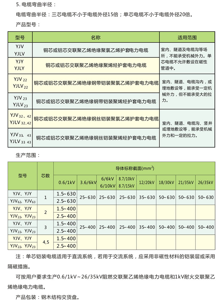 二、使用范圍 本產(chǎn)品適用于配電網(wǎng)、工業(yè)裝置等領(lǐng)域,用于固定敷設(shè)在交流50HZ、額定電壓0.6/1kv的電力輸配電線路上,主要功能是輸送電能。本產(chǎn)品為通常條件下使用的產(chǎn)品,不適用一些特殊條件的場合,如架空、水下、船底、海底、核電站等。