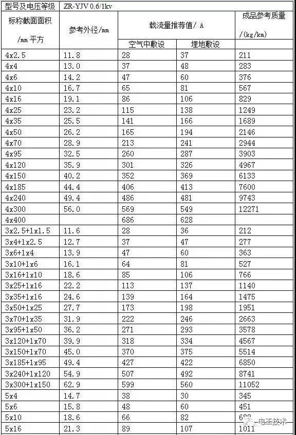 常見ZR-YJV電力電纜載流量表